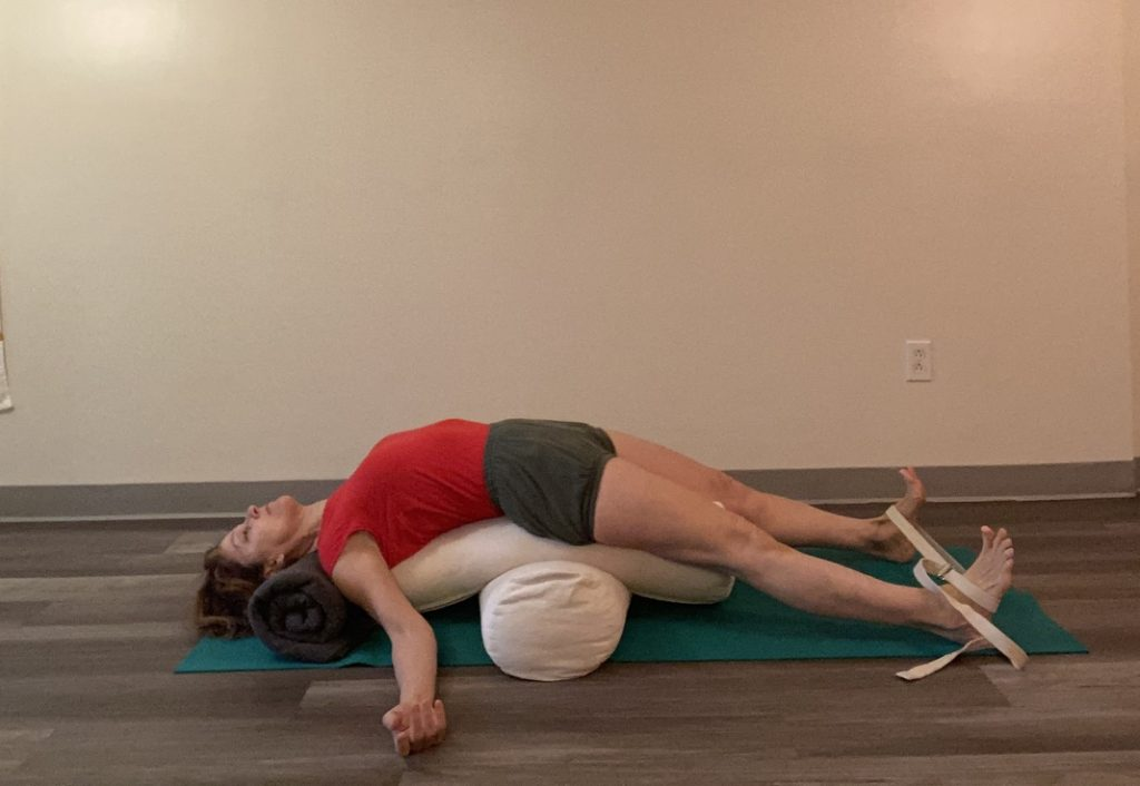 Matériel requis en ligne : cordes au mur (de préférence), chaise de yoga, 1 ou 2 coussins, 2 blocs, 2 ceintures, 4 couvertures.
